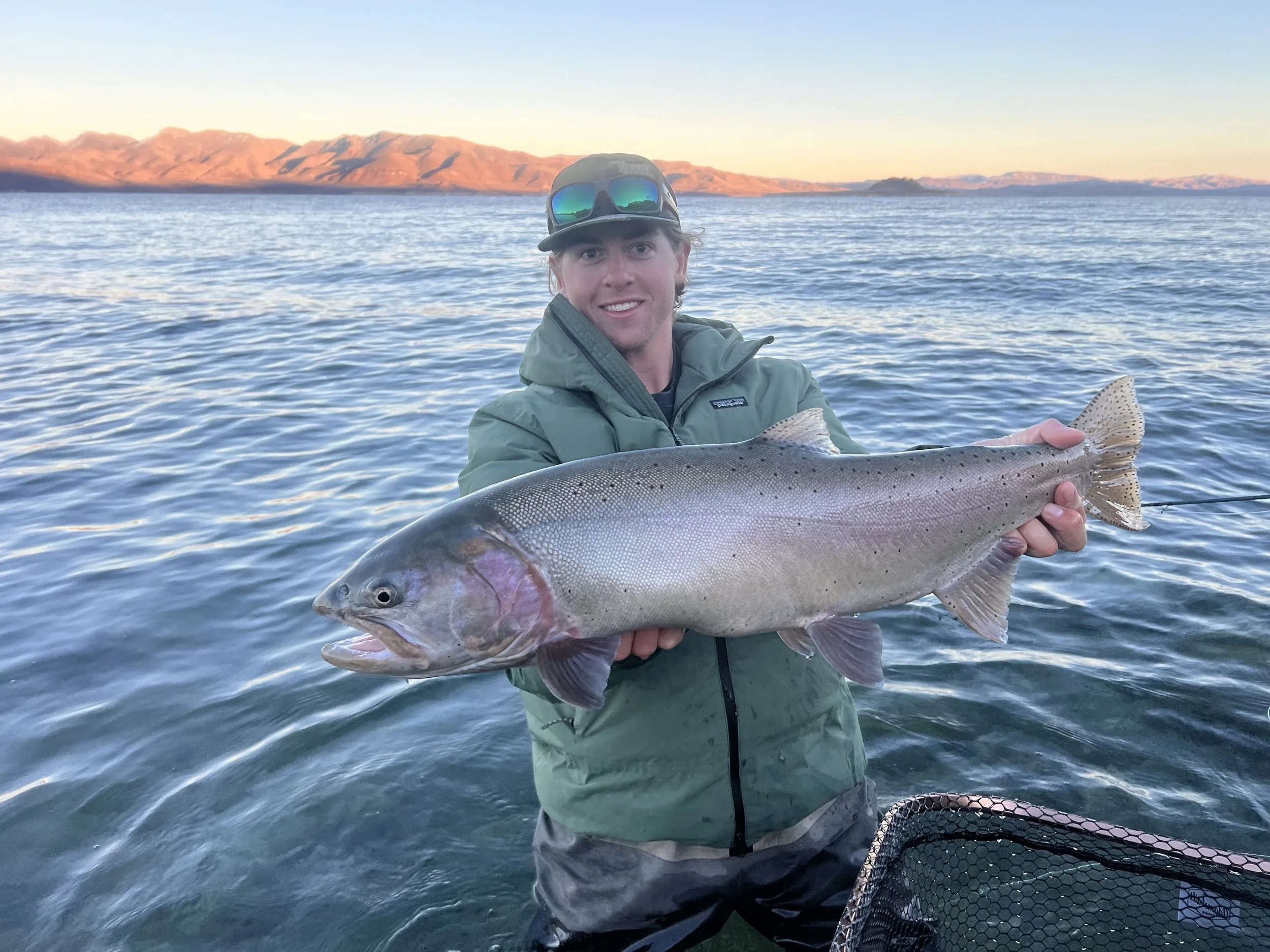 A perfect morning: James and his son Ethan came down from Monterey Bay for their chance at the biggest cutthroat trout in the world. As we all do, Ethan kept a close eye on shifting weather patterns and wind, and boy was this one accurate. We started pretty centrally located on the lake and found a spot where the wind would not give us too hard of a time. Waiting for the sun to creep over the horizon, we laughed and talked about fish stories and of course the ones that got away.